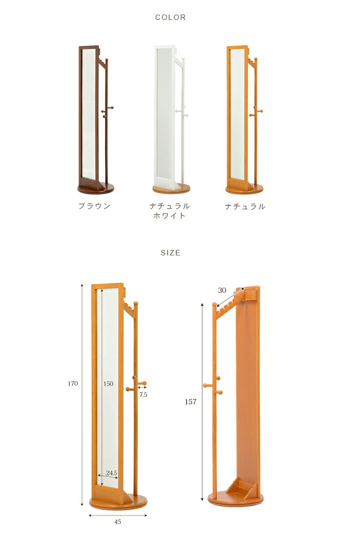 ▼回転ミラー サイズ (約)幅φ45×高さ170cm 素材 主材:ラバーウッド 全身用 全身 全身ミラー 収納 収納ミラー 姿見 姿見ミラー 回転ミラー ハンガー ハンガー付きミラー スタンドミラー スタンド ミラー 鏡 全身鏡 家具 インテリア インテリア雑貨 雑貨 通販 オシャレ お洒落 安い 激安 特価 高級感 シンプル デザイナーズ かわいい ランキング 人気 北欧 ナチュラル アンティーク モダン おすすめ プレゼント ギフト 贈り物 記念 誕生日 結婚祝い 引越し 引っ越し 新居 ワンルーム 一人暮らし 二人暮らし カテゴリ:ミラーミラー部分をくるっと回せば洋服やバッグ、小物が掛けられるハンガーラックに。